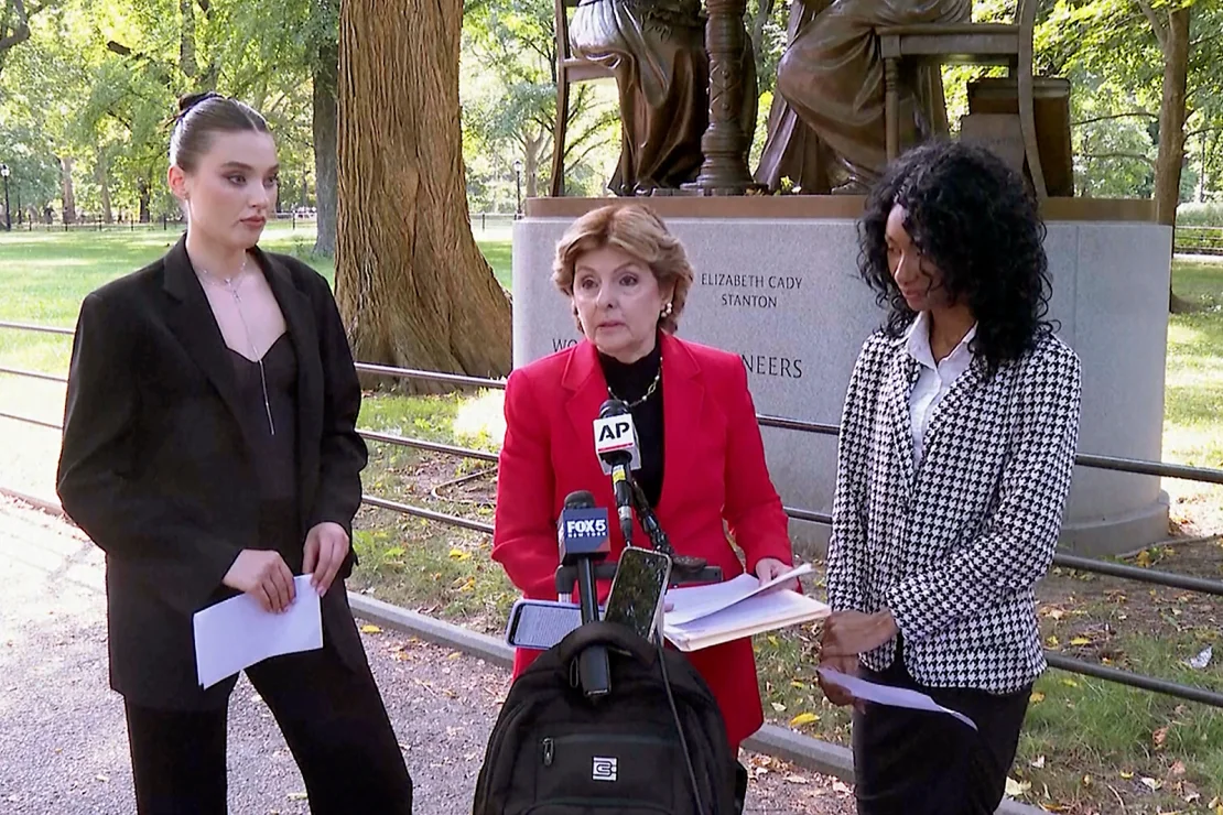 Flanqueada por Veronika Didusenko, izquierda, y Danielle Hazel, derecha, la abogada Gloria Allred, centro, habla durante una conferencia de prensa el 16 de septiembre de 2024, en Nueva York. (Crédito: Joe Frederick/AP)